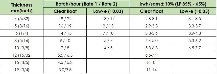 | Thickness mm(inch) | Batch/hour (Rate 1 / Rate 2) | kwh/sqm ± 10% (LF 85% – 65%) | ||