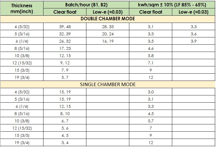 Thickness mm(inch) Batch/hour (B1, B2) kwh/sqm ± 10% (LF 85% – 65%)
